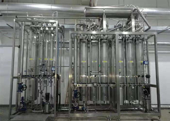 多效蒸馏水机是注射用水制备系统的关键设备。系列列管式多效蒸馏水机完全符合药品生产规范GMP验证要求。以纯化水为原料水,采用工业蒸汽加热,经过高温高压生产高质量的注射用水,确保稳定生产无热原注射用水。本机生产的注射用水满足中国药典、美国药典、欧洲药典对注射用水的规范要求。设备采用三级分离工艺,保证注射用水内毒素指标不超过0.25EU/ml,具有连续去除不凝性气体。